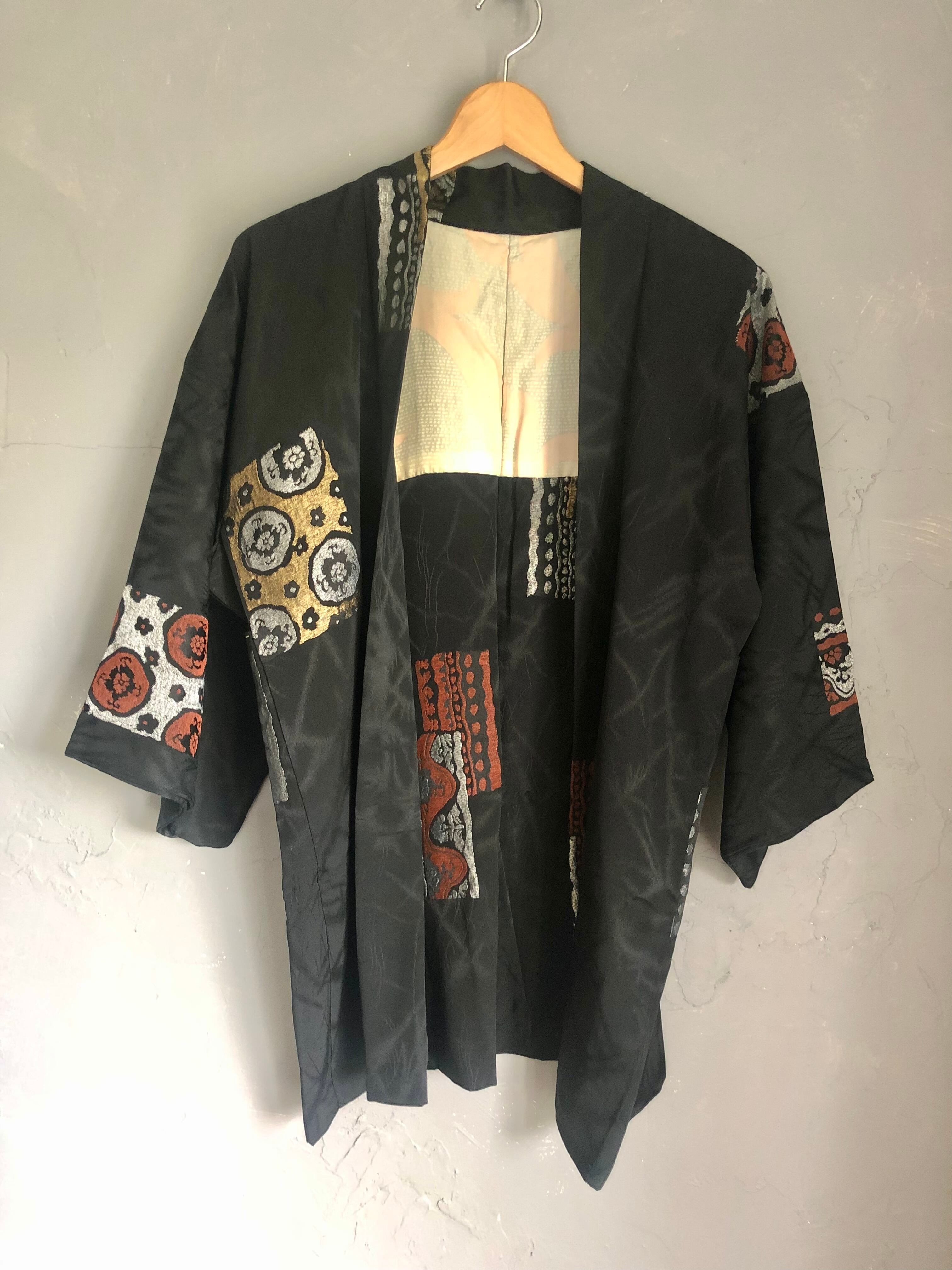 正絹(シルク)羽織りの袖丈を適度にカットし、気軽に羽織れるジャケットを作りました。