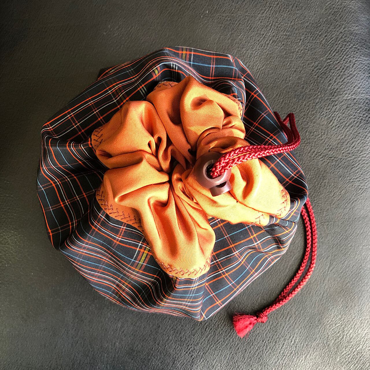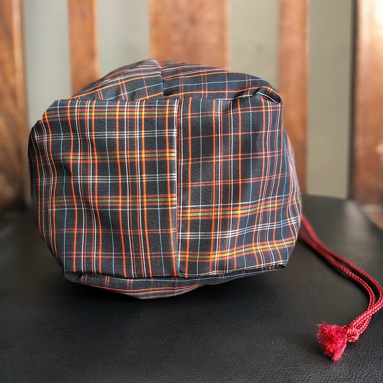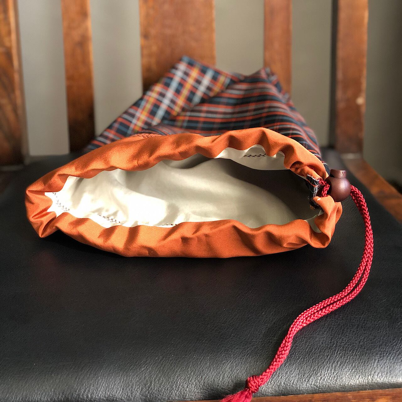 米沢紬(チェック)の袷着物の袖を巾着袋にリメイクしました。
