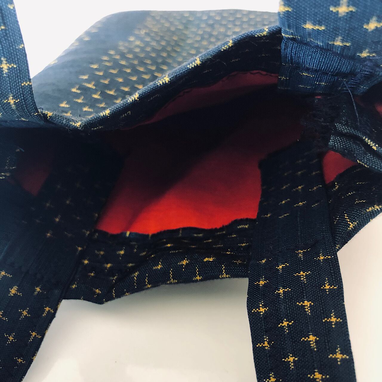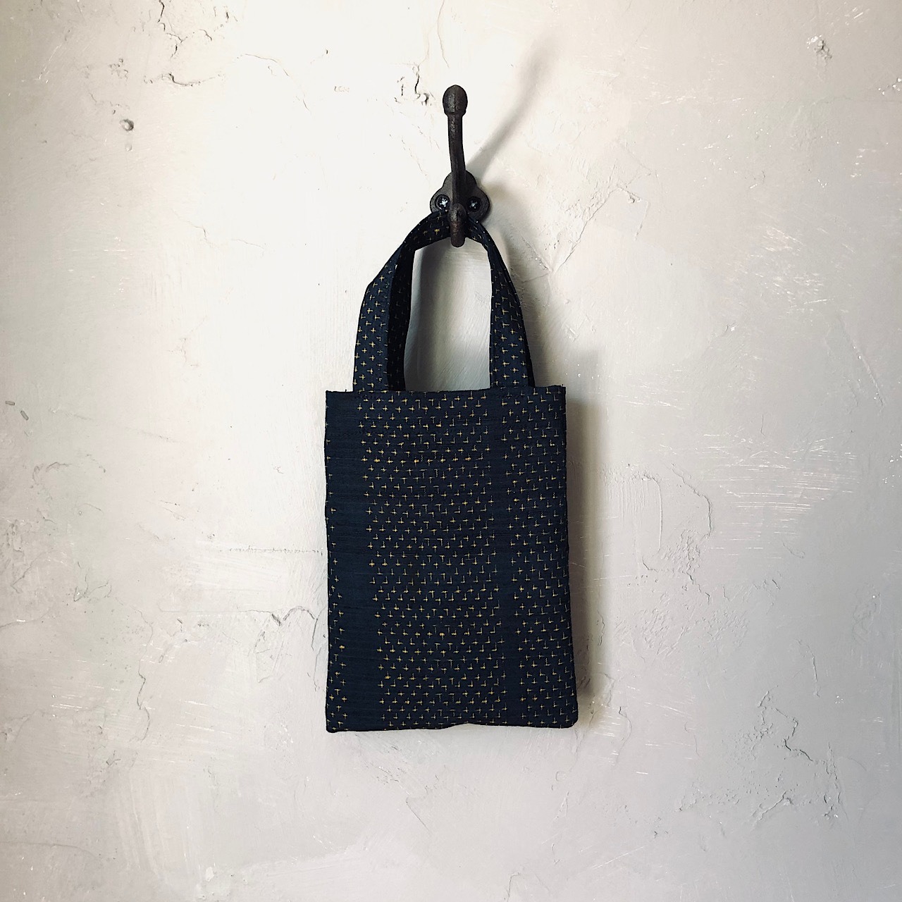 正絹(シルク)の紬袷着物を丁寧に解き、スマホが入るくらいのミニバッグを作りました。内布にはアンティーク着物の裏地を使っています。
