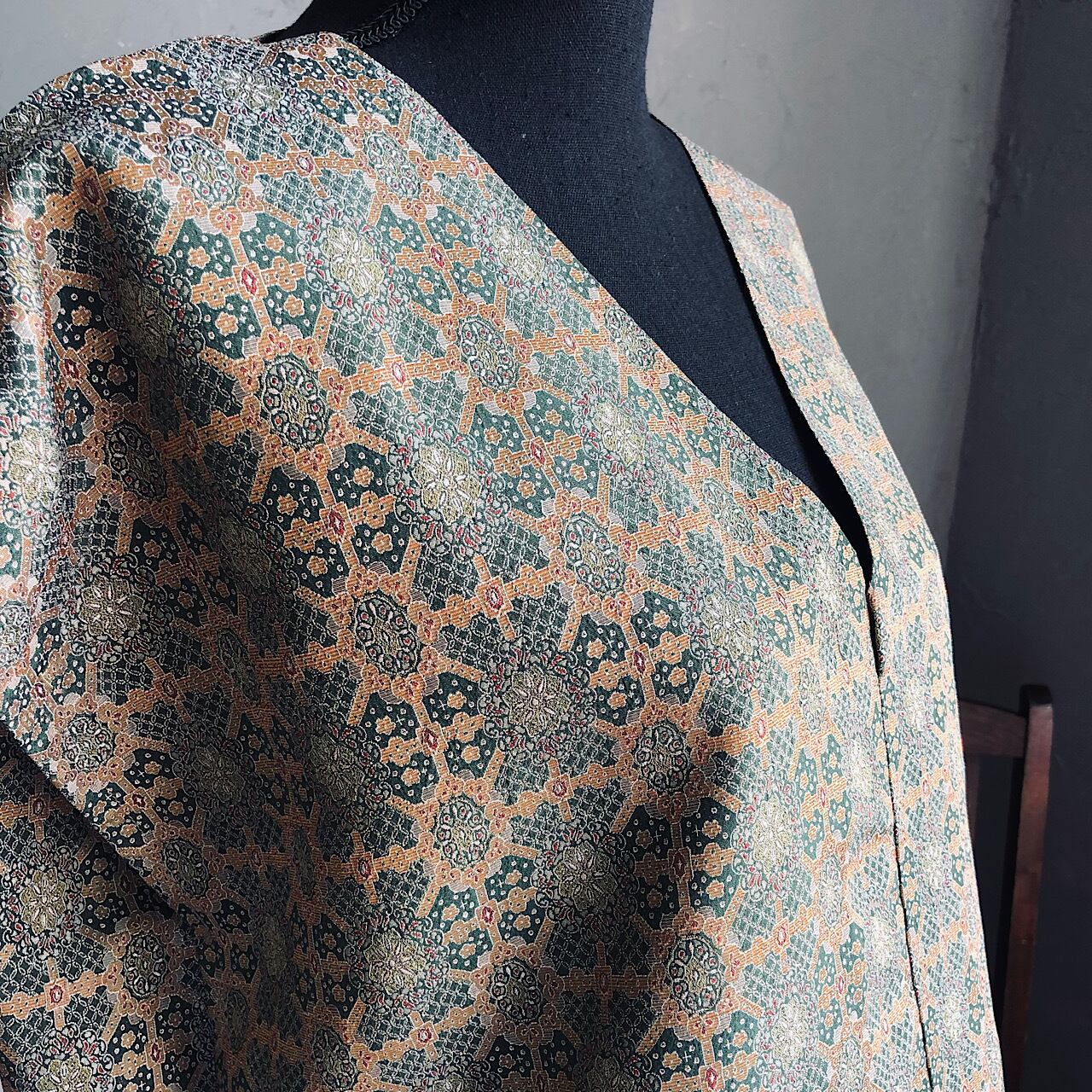 ハリのある化繊布地。軽量で身体を締めつけません。光の当たり具合で色味の変わるアラベスク紋様が高級感を与えてくれます。