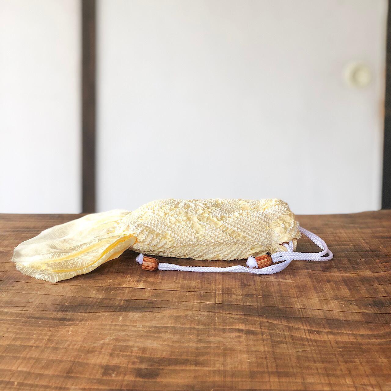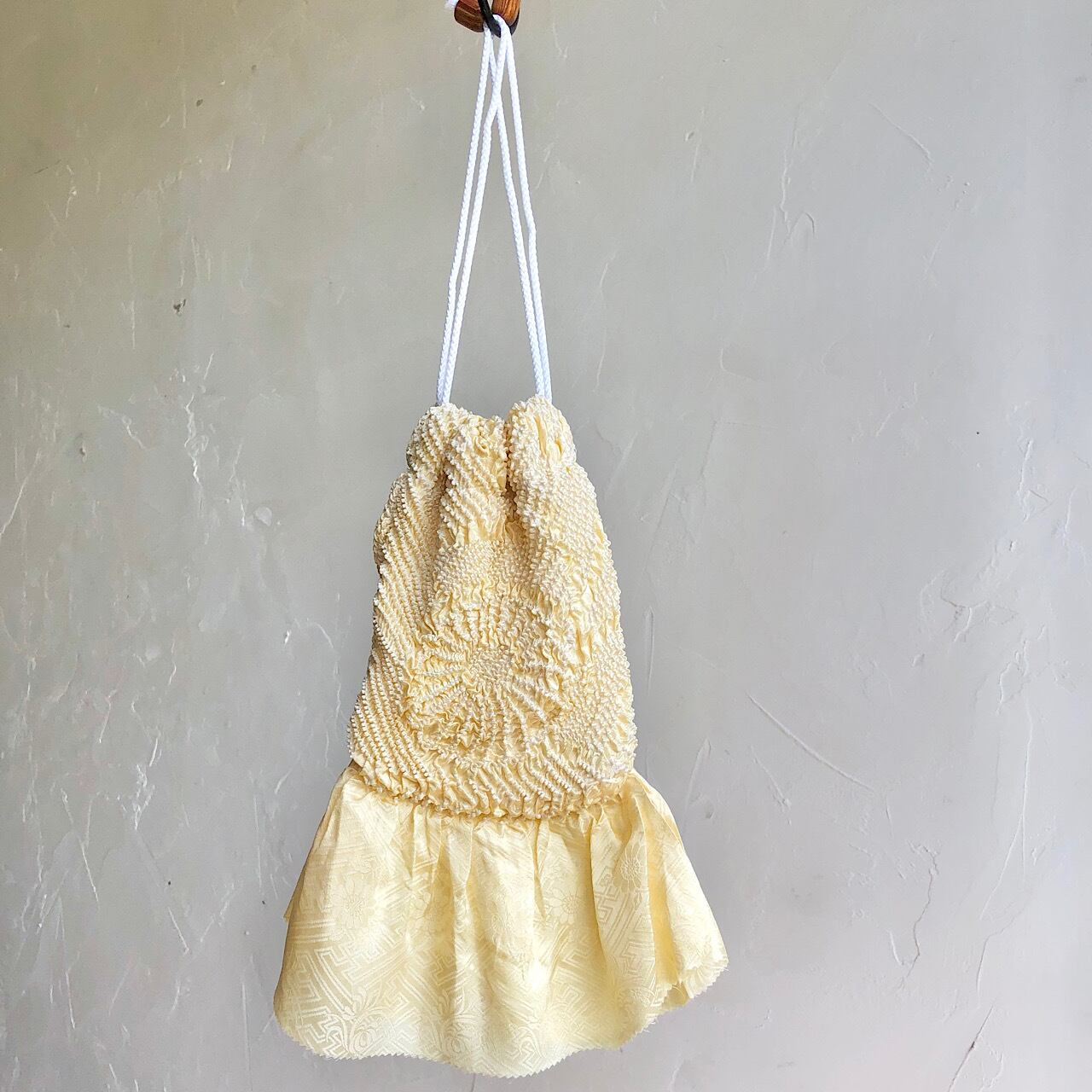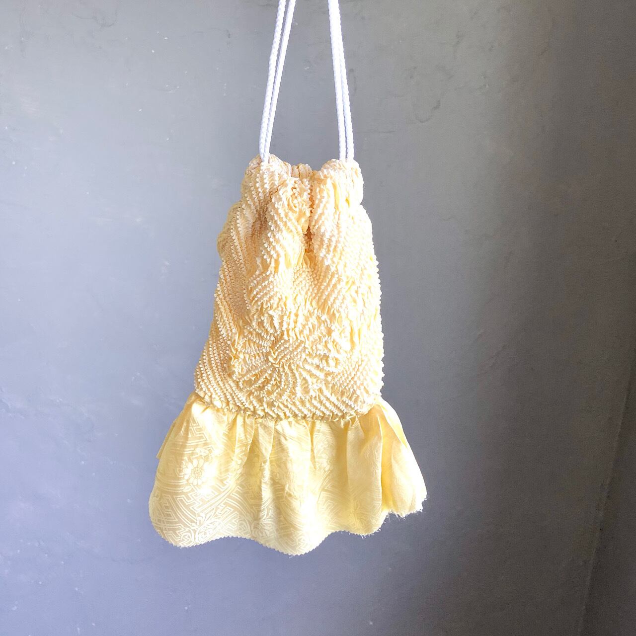 ポップなレモンイエロー・絞りの帯揚げで巾着袋を作りました。