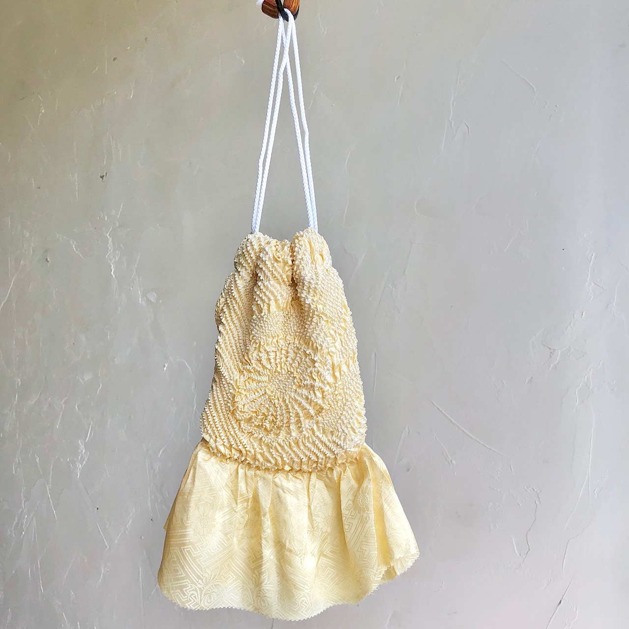 しっかりと入ったシボの手触りはなんとも言えず気持ち好いです。底にフリルをつけたら金魚のような、ドレスのような、カワイイ巾着袋になりました。
