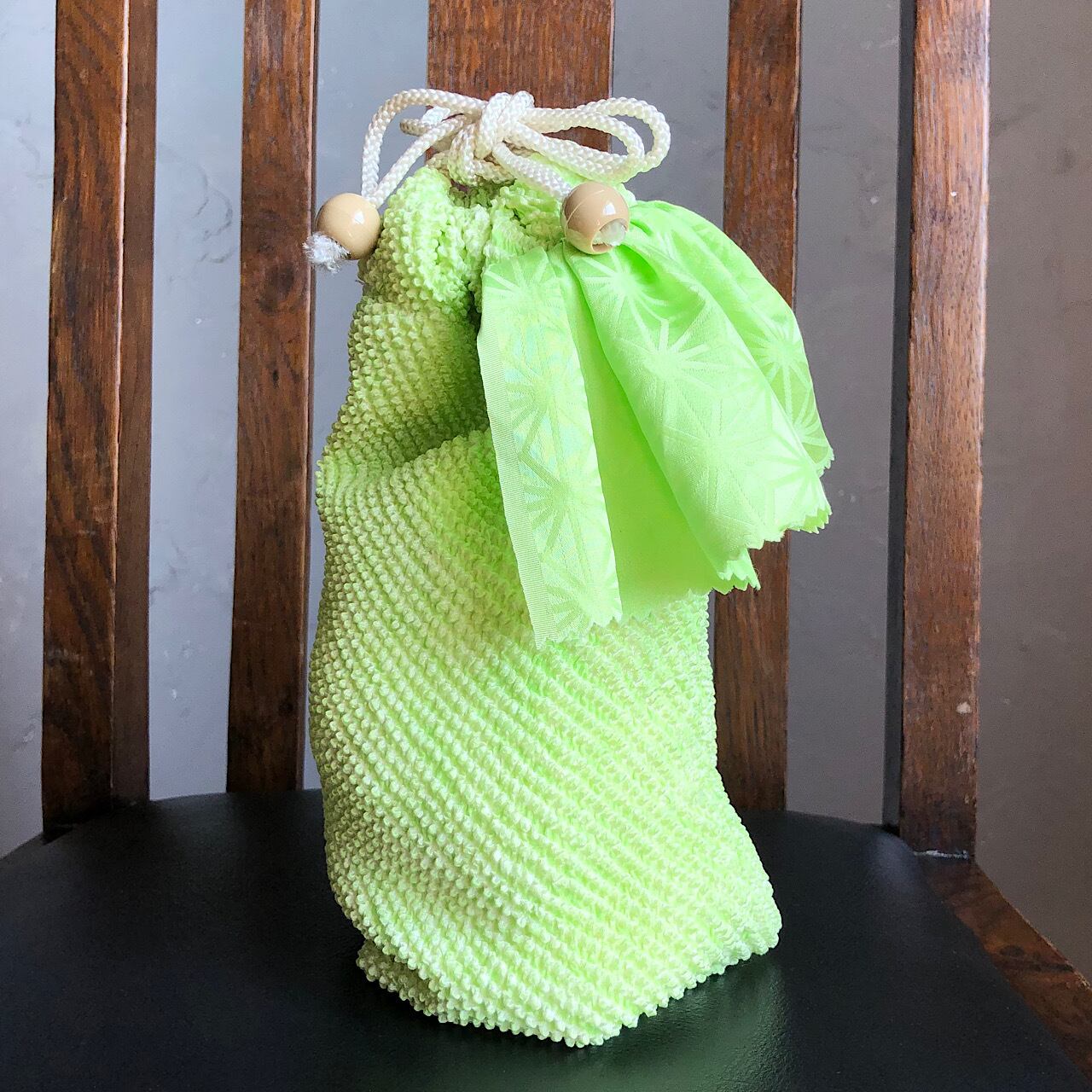ポップなネオングリーン・絞りの帯揚げで巾着袋を作りました。